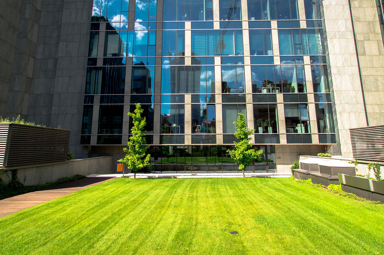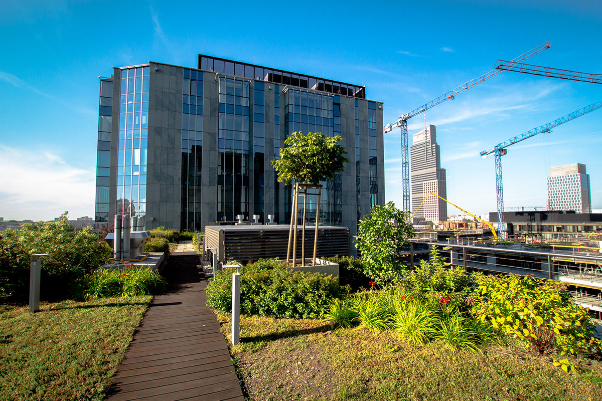 Nowoczesny budynek biurowy. Zieleń zlokalizowana na czterech poziomach budynku w tym główne użytkowe tereny zieleni zaaranżowane na poziomach +1 oraz +7. Założenie nowoczesne lecz nawiązujące do historii budynku. Nowoczesne materiały. Elementy wyposażenia terenu z cortenu i betonu architektonicznego. Rabaty bylinowe kwitnące przez cały sezon wegetacyjny. Zieleń umożliwiająca chwilę oddechu od intensywnej pracy.