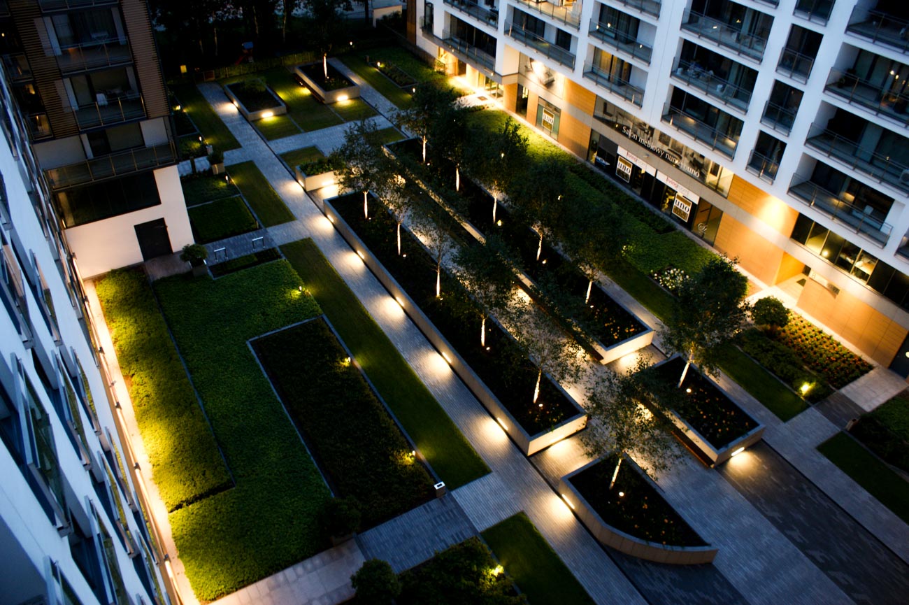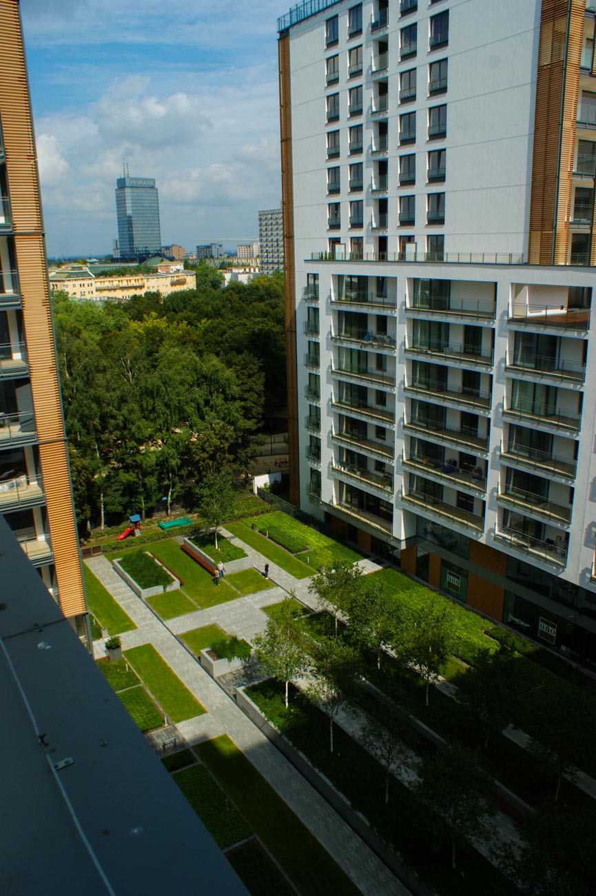 Luksusowy apartamentowiec położny w centrum Warszawy. Teren zagospodarowany w sposób ascetyczny, geometryczny, prosty w swojej formie a jednocześnie zróżnicowany. Na stropie garażu na terenie patio nasadzenia 13 sztuk dziesięciometrowych brzóz. Tysiące kwitnących każdą wiosną narcyzów. Setki rododendronów. Świetny mariaż nowoczesnej architektury ze współczesną architekturą krajobrazu.
