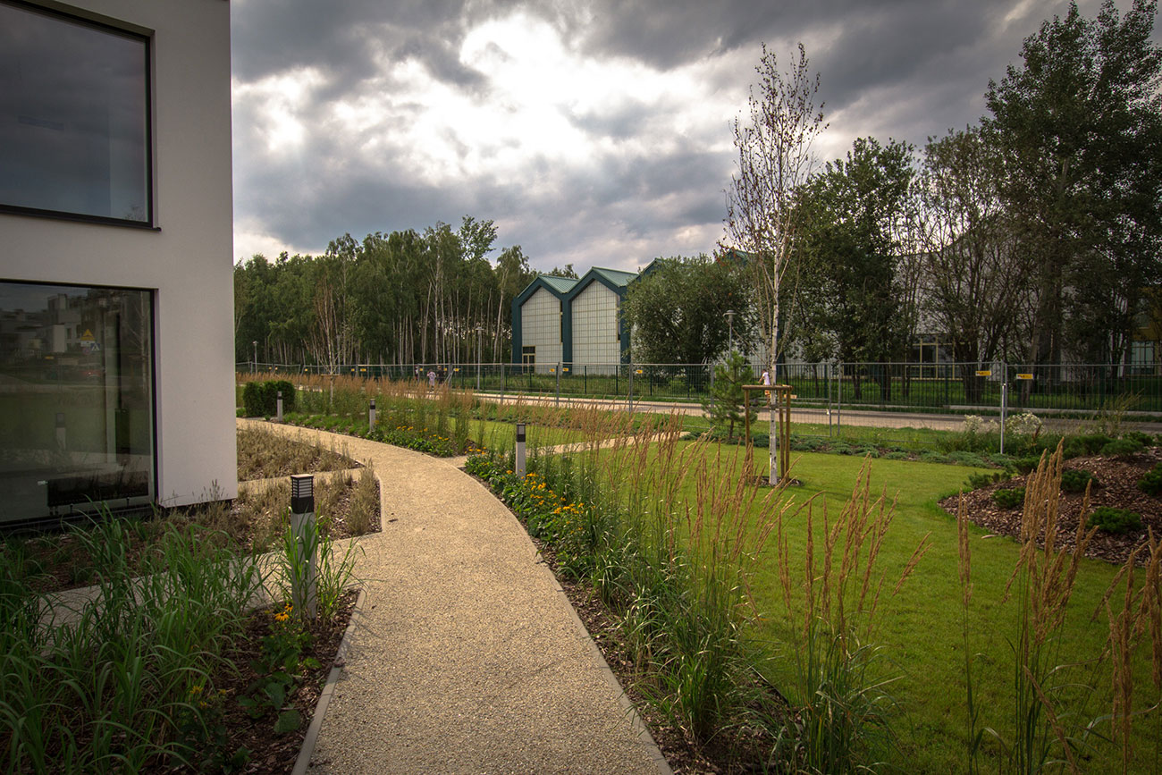Sielanka w centrum miasteczka Wilanów. Kilkanaście gatunków traw, kilkadziesiąt nowo nasadzonych brzóz. Nowoczesne w formie, wielokolorowe place miejskie wykonane z ekologicznych nawierzchni mineralnych. Nowoczesna architektura podkreślona scenografią w postaci współczesnych w formie nasadzeń. Enklawa zieleni.